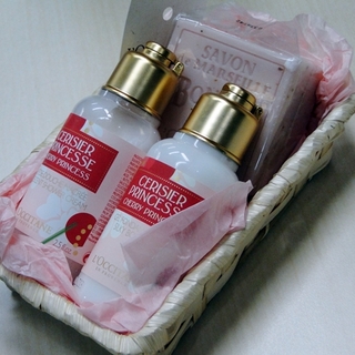 きれいなチェリーブロッサムの香りのシャワークリームとシルキーボディジェルに、ワイルドローズの香りのボンメールソープのセット。カゴに入ったロクシタンのオリジナルラッピングです。