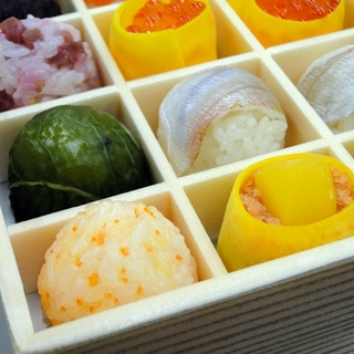 美しい黄色の薄焼き卵に包まれたいくらのお寿司、やはり薄焼き卵に包まれた栗おこわのお寿司、小鯛の手まり寿司、海老の手まり寿司、紫蘇の葉で包まれた小鯛の手まり寿司...どれもひと手間加えられていて、職人が手をかけた味が楽しめます。